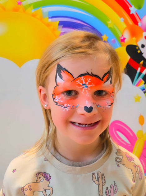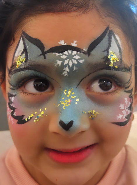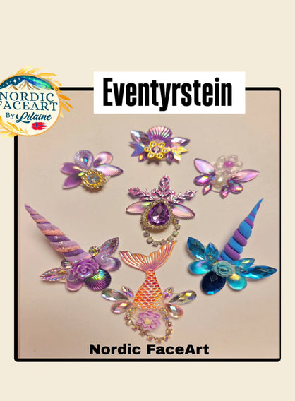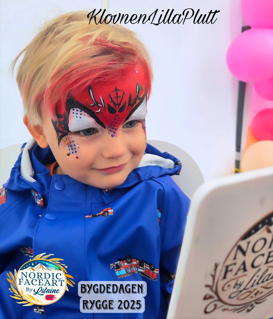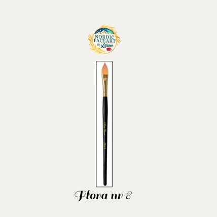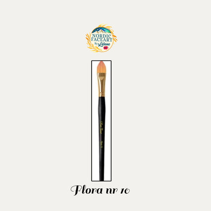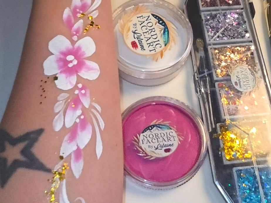 Jeg bruker pensel Flora nr. 8 for blomst design. Hvit maling- Snøfnugg 90g blande til en kremet konsistens og tørker av overskuddsfarge på toppen av penselen. Deretter legger jeg Solbærglans - Shimmer 30g, former blomsten med 5 blader, til bladene og avslutter med glitter.