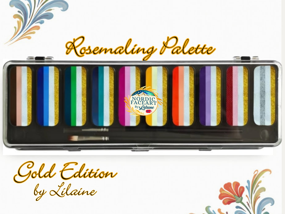 Rosemaling Palette – Gold Edition er en eksklusiv palett inspirert av tradisjonell norsk rosemaling. Med rike farger, luksuriøse gulltoner og perfekt sammensatte striper er den ideell for one stroke, detaljer og dekorative design. Skapt for både profesjonelle og kreative sjeler som vil gi kunsten et nordisk preg.