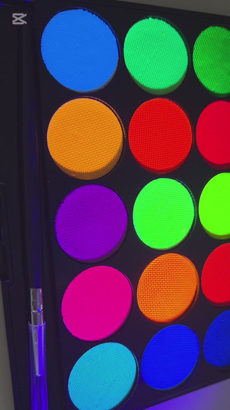 Denne fantastiske UV-pastellpaletten fra Nordic Faceart inneholder 15 sterke, levende farger som gløder intenst under UV-lys og svartlys. Perfekt til festivaler, konserter, temafester, halloween, klubbkvelder og mye mer.